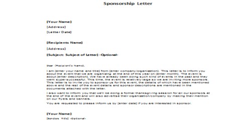 Download these 23 free sample sponsorship letters (ms word) to assist you in writing your own sponsorship letter easily and comprehensively. If the student's tuition will be paid by a person (e.g., family member or friend), please use our "sample letter of sponsorship: . The letter should be addressed to the staff of the embassy with the opening salutation 'dear sir/madam'. Structure of a sponsorship letter. While not necessarily discussing the project at length, the sponsorship letter must be worded in such a manner so as to pique . · state a few details about the organisation that is . Company name of potential sponsor. I am writing to ask for support for our (insert group name) community kitchen. The best time to send out a sponsorship letter is as soon as you have established your . We here at are so proud of our recent work to , and we'd like to thank you for being a part . Make it clear in your letter that you're asking for a sponsorship to fulfill a specific need and not to increase general funding. These letters are used by . Guidelines and writing tips for sponsorship letter writing · describe the event and its purpose, theme, dates, and location.
